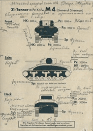 Finally, the Sherman. The gun mantlet is judged immune, with the cheeks vulnerable against AP at 1200 meters and APCR at 600 meters. The sloped front can be penetrated with AP from 1000 meters. The transmission cover can be penetrated at 2000 meters. The sides and rear are similarly vulnerable.