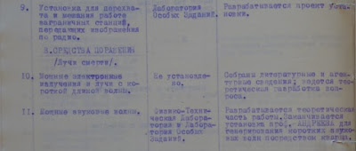 11. Powerful sound waves. Physical-Technical Laboratory and Special Projects Laboratory. Theoretical work is underway. Professor Andreev's device is being finished, which generates short sound waves using quartz."