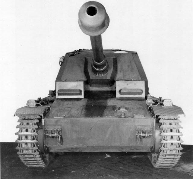 "2. German 105 mm self propelled gun. According to data from British sources, the Germans installed their 105 mm gun mod. 18 (10 cm K.18) into an armoured SPG. The gun fires the mod. 19 high explosive grenade (medium charge) and an armour piercing Panzergranate Rot shell (maximum charge). The maximum range of the 105 mm gun at medium charge is 15,600 meters. The muzzle velocity at maximum charge is 820 m/s."