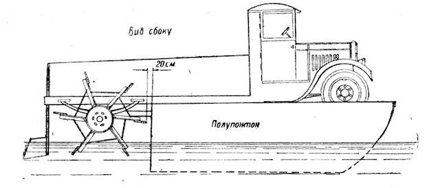When crossing deep rivers, drivers of the Nth Front successfully used a ZIS-5 truck to tow a barge. Equipped with special wheels, the truck could easily tow 12 ton barges at a speed of 4 kph (see figure).